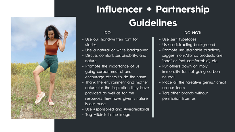 This style guide focused on how Allbirds stays consistent when using social media. For this style guide, we showed how to stay on-brand with the tone of voice, do and don'ts, and words and phrases to use. This is just a sample of the full document. To see the full in-depth document, click here.
